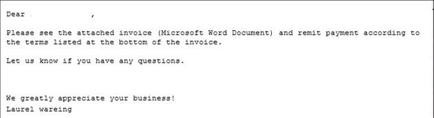 Ransomware Locky jest rozsyłany w dokumentach o formacie .doc za pośrednictwem Microsoft Outlook lub Office 365. Niczego nieświadoma ofiara otrzymuje załącznik do wiadomości e-mail, który jest fałszywą fakturą. Zwykle w treści wiadomości pojawia się następująca informacja: „Prosimy zapoznać się z załączoną fakturą (dokument Microsoft Word) i dokonanie płatności zgodnie z warunkami wymienionymi w dolnej części faktury. Skontaktuj się, jeśli masz pytania. Jesteśmy wdzięczni za współpracę”. W języku angielskim wygląda to następująco: