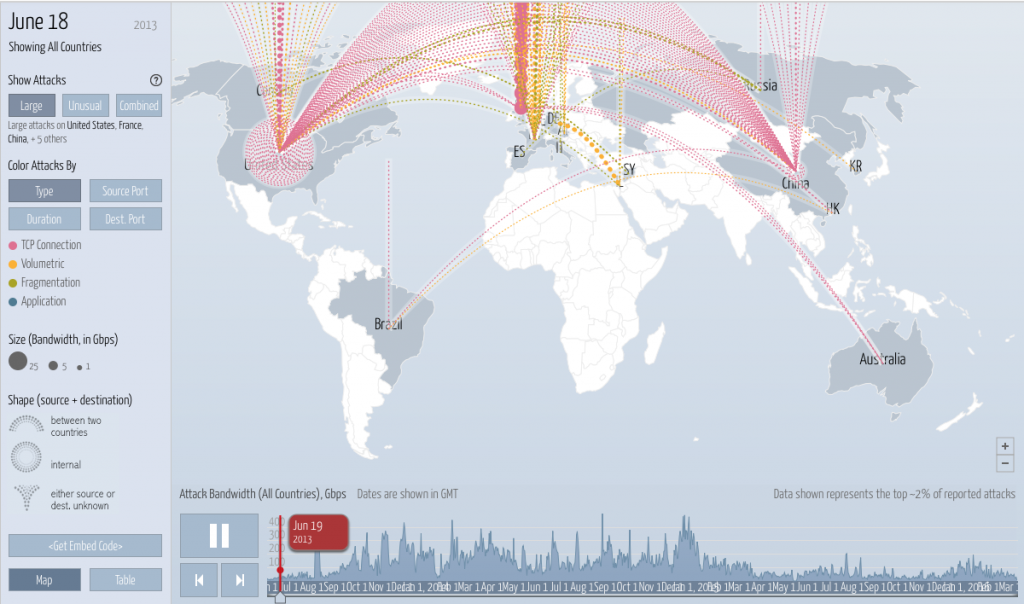 1) digitalattackmap.com – Digital Attack Map jest projektem powstałym przy wspólpracy Google Ideas oraz Arbor Networks. Jest to bezpłatna usługa typu LIVE wizualizujące bierzące ataki na podstawie analizy ruchu sieciowego. Często skala ataków może być niedoceniona. W takim przypadku możemy zobaczyć na mapie jak wygląda przebieg atakyu lub usługa ta oferuje również historyczne dane, które możemy odtworzyć w formie animacji.