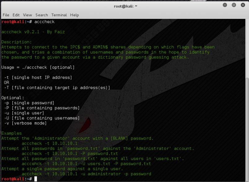 acccheck jest narzędziem do przeprowadzania ataków słownikowych na uwierzytelnianie w systemie windows przy pomocy protokołu SMB. Skrypt ten napisany w perlu jest tak naprawdę parserem obudowującym standardowego klienta smbclient.