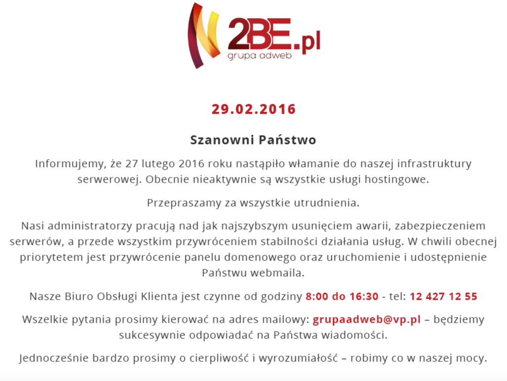 Z kominikatu na stronie 2be.pl oraz na FB wiemy że strona padła ofiarą ataku oraz, że stracili cała kontrolę nad swoimi maszynami. Z tego co można zauważyć nie działają żadne usługi hostingowe. Obecnie na stronie można znaleźć poniższy komunikat: